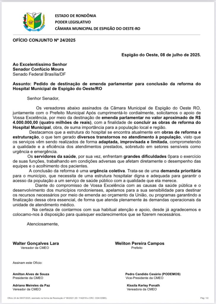 O vereador Walter Lara (Waltinho), de Espigão do Oeste, esteve em Brasília nesta semana, onde foi recepcionado pelo senador Confúcio Moura para tratar da destinação de recursos voltados à conclusão da reforma do Hospital Municipal. O parlamentar municipal apresentou formalmente um ofício, assinado por todos os vereadores da Câmara e pelo prefeito Weliton Campos, solicitando a alocação de R$ 4 milhões em emenda parlamentar.
